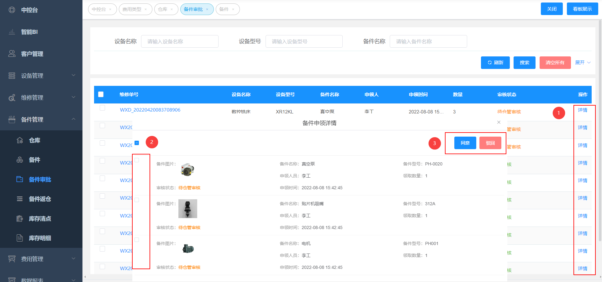 仓管人员点击同意,管理员点击驳回,备件申领不成功。